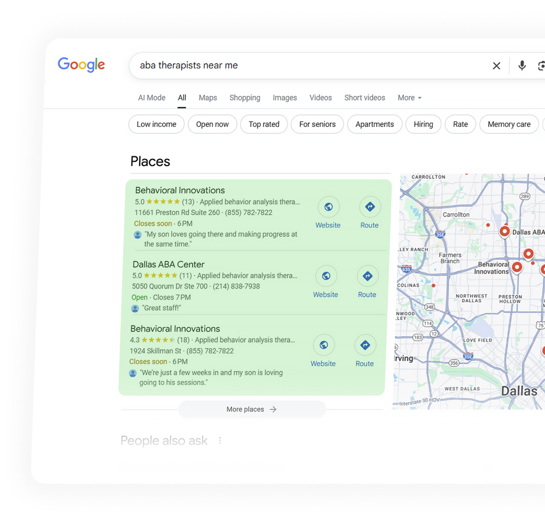 Book a Strategy SessionWhen someone searches ‘autism help near me,’ or ‘adhd help near me,’ and your listing doesn’t appear, you’re losing clients—and authority. Our AI-driven solutions improve your rankings in neighboring cities, making sure your business gets seen and trusted.