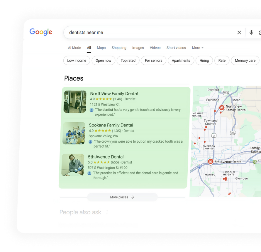 When someone searches ‘dentists near me,’ and your listing doesn’t appear, you’re losing clients—and authority. Our AI-driven solutions improve your rankings in neighboring cities, making sure your business gets seen and trusted.