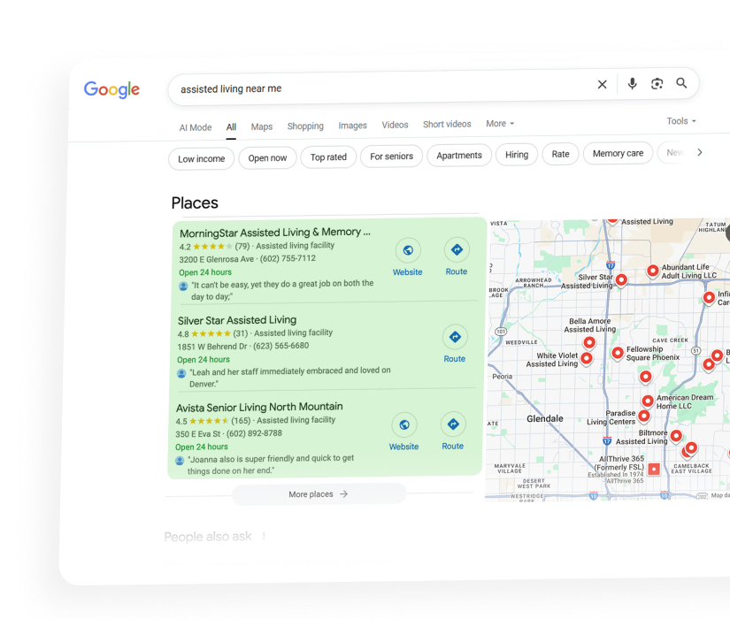 When someone searches ‘assisted living near me,’ or ‘elder care near me,’ and your listing doesn’t appear, you’re losing clients—and authority. Our AI-driven solutions improve your rankings in neighboring cities, making sure your business gets seen and trusted.