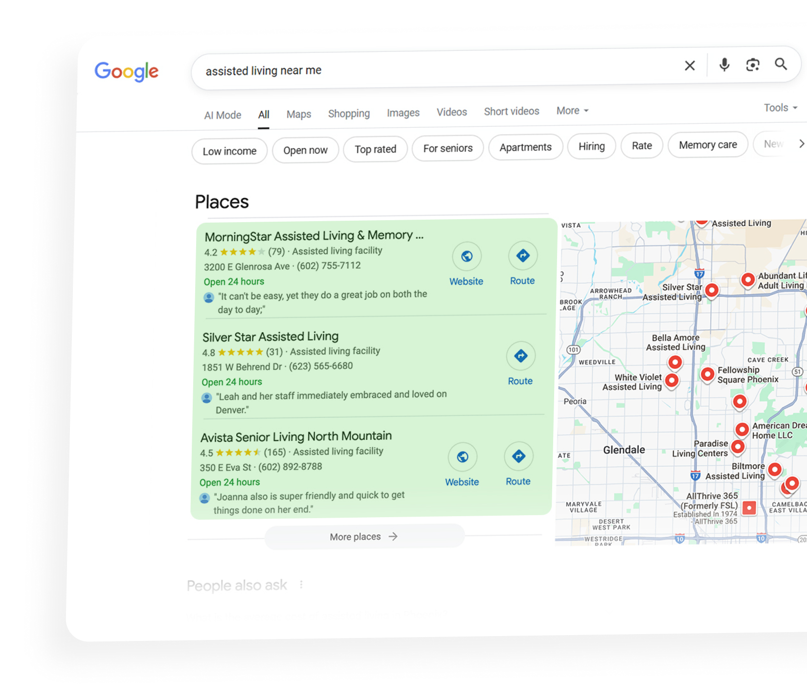 Book a Strategy SessionWhen someone searches ‘assisted living near me,’ or ‘elder care near me,’ and your listing doesn’t appear, you’re losing clients—and authority. Our AI-driven solutions improve your rankings in neighboring cities, making sure your business gets seen and trusted.