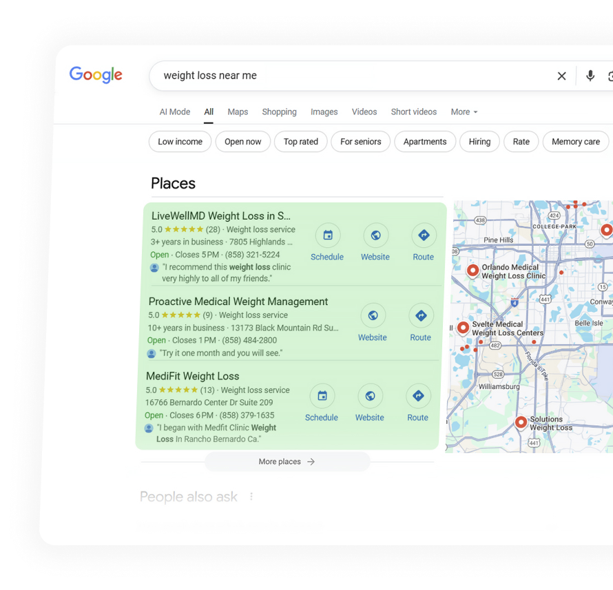 Book a Strategy SessionWhen someone searches ‘weight loss programs near me,’ and your listing doesn’t appear, you’re losing clients—and authority. Our AI-driven solutions improve your rankings in neighboring cities, making sure your business gets seen and trusted.