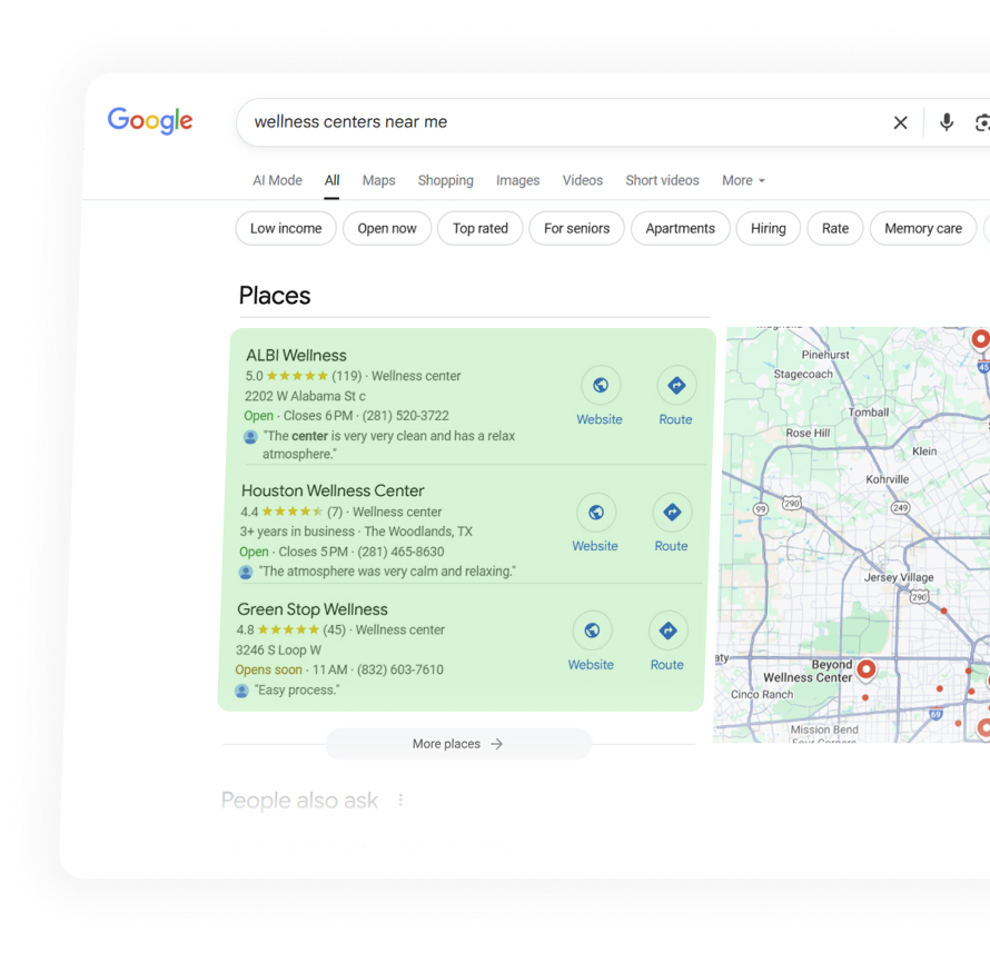 When someone searches ‘wellness centers near me,’ and your listing doesn’t appear, you’re losing clients—and authority. Our AI-driven solutions improve your rankings in neighboring cities, making sure your business gets seen and trusted.